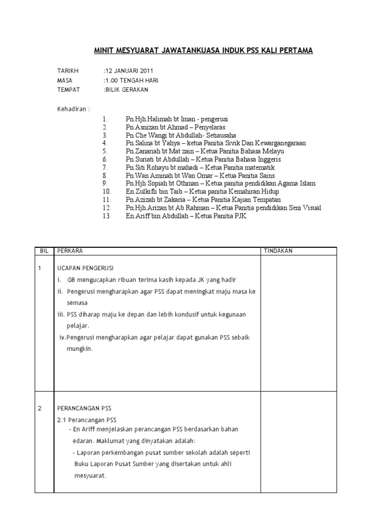 Minit Mesyuarat Jawatankuasa Induk Pss Kali Pertama1 Pdf